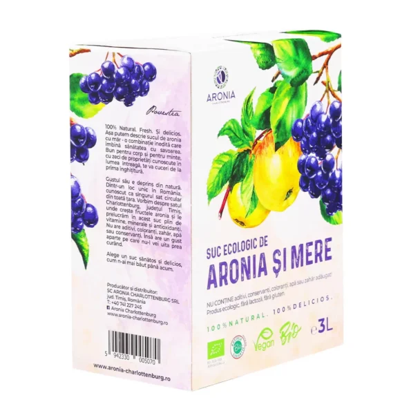 Etichete: suc natural ecologic, aronia şi măr, presare la rece, antioxidanți naturali, certificare bio, fără conservanți