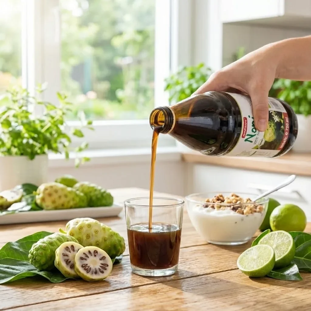 Pentru persoanele care nu tolerează gustul specific al sucului de noni, poate fi amestecat cu suc natural de mere sau portocale proaspete. Sticla trebuie agitată înainte de fiecare utilizare pentru redistribuirea uniformă a sedimentului natural care poate apărea la produsele nepasteurizate sau pasteurizate blând. După deschidere, produsul se păstrează la frigider și se consumă în maximum 10 zile pentru menținerea prospețimii și activității antioxidante optime.