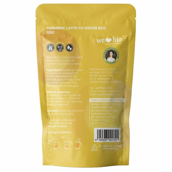 Etichete: turmeric latte bio, pudră de cocos, băutură caldă naturală, curcuma, vegan, fără lactoză