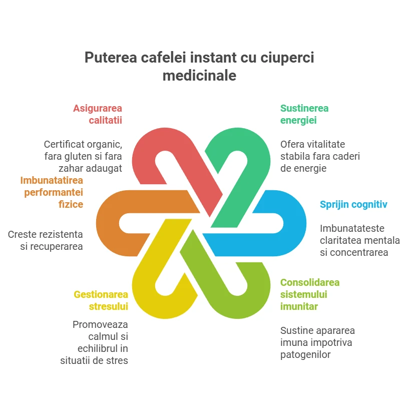 Etichete: Cafea instant bio, ciuperci medicinale, Energizant natural, Supliment alimentar, Antioxidanti, Sustinere imunitate