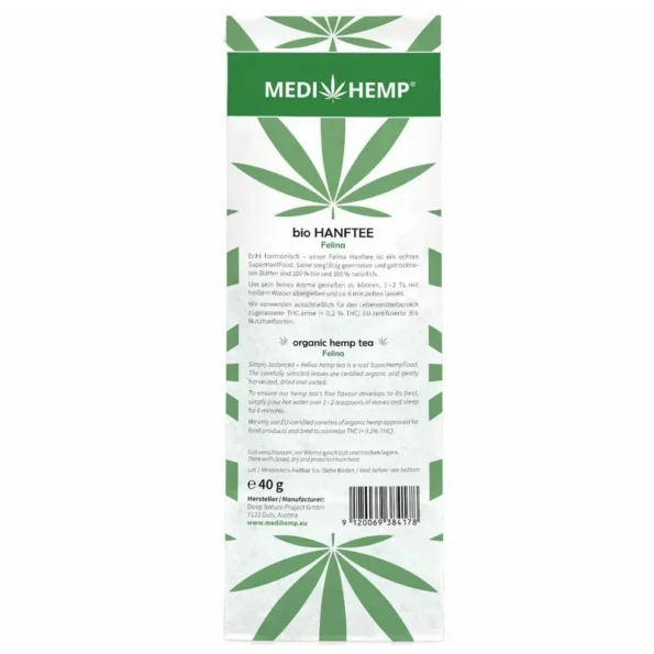 Ceaiul de canepa Felina Bio de la Medihemp te învăluie într-o experiență plăcută și liniștitoare. Preparat din frunze de canepa ecologică cultivate cu grijă în insula Burgenland din Austria, acest ceai îți oferă o pauză de relaxare în mijlocul unei zile agitate. Frunzele sunt culese manual și uscate natural pentru a păstra aroma autentică și compușii activi ai plantei.