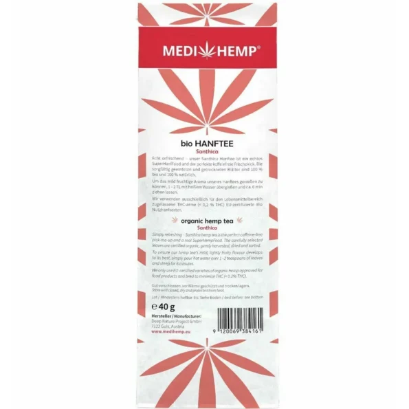 Ceaiul de canepa Santhica Bio din frunze proaspete de canepa îți aduce starea de bine și energia de care ai nevoie. Cultivat cu grijă în insula Burgenland din Austria, acest ceai îmbină tradiția cu beneficiile plantei de canepa. Frunzele sunt culese manual și uscate natural pentru a păstra toate proprietățile valoroase.