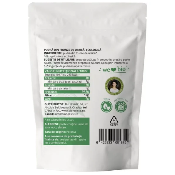 | Ingrediente | Pulbere din frunze de urzică din agricultură ecologică |