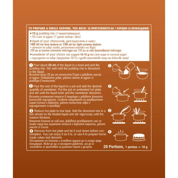 Această budincă este special creată pentru iubitorii de deserturi naturale. Gustul dulce-amărui specific roscovelor este completat de textura cremoasă obținută din amidonul de porumb de calitate. Produsul nu conține lactoza sau gluten, fiind astfel accesibil unui număr mare de consumatori.
