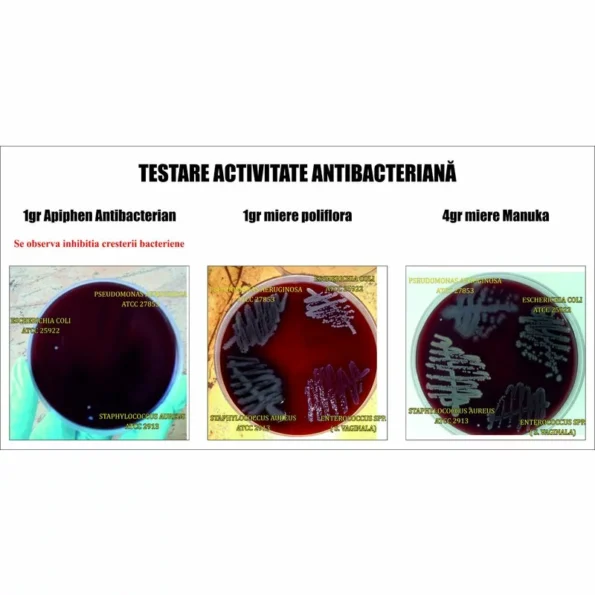 Apiphen este un supliment alimentar inovativ, ce combină proprietățile benefice ale mierii de mană românească cu extract de propolis și antioxidanți din struguri (Antioxivita). Această formulă unică a fost testată în laboratoarele din Elveția, demonstrând o acțiune antibacteriană puternică împotriva bacteriilor patogene frecvent întâlnite, precum E-coli și stafilococul auriu.