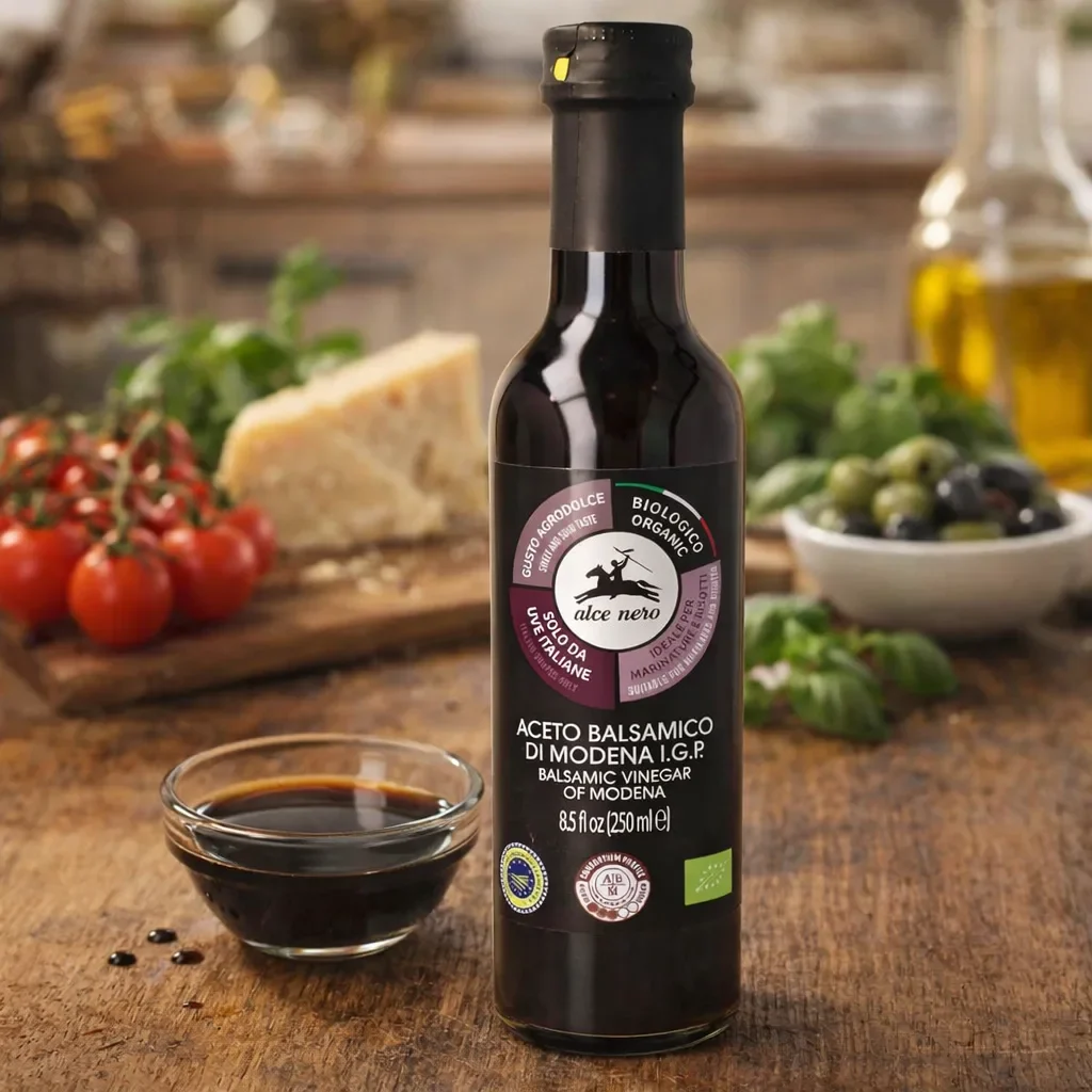 Etichete:oțet balsamic bio Modena, condiment premium italian, IGP certificat organic, ingredient gourmet pentru salate, oțet filtrat pentru bucătărie, Alce Nero Italia autentic
