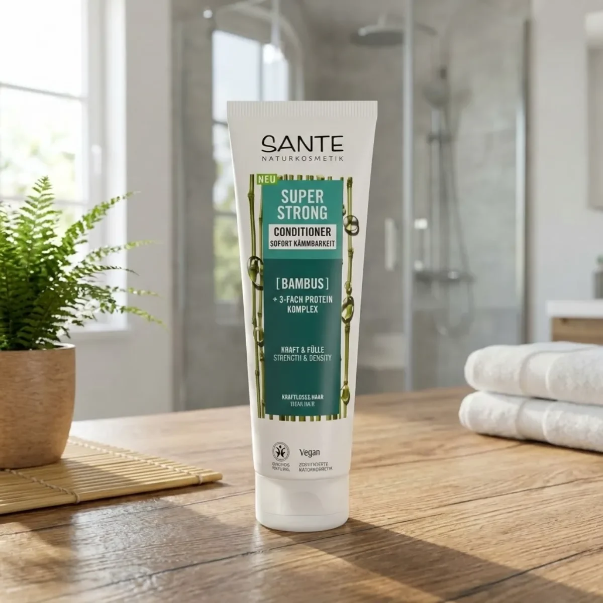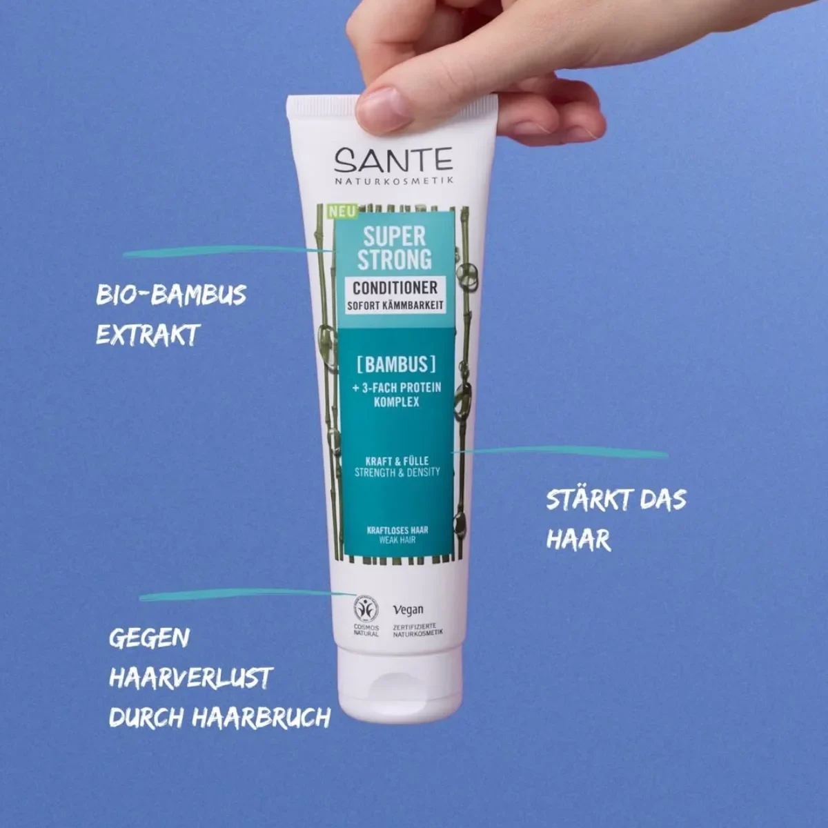 Balsamul super puternic pentru păr de la Sante este o formulă avansată de îngrijire, special creată pentru părul fragil și predispus la rupere. Acest balsam intensiv combină puterea extractului organic de bambus cu un complex triplu de proteine pentru a oferta părului tău exact nutrienții de care are nevoie. Formula inovatoare germană conține un amestec unic de proteine hidrolizate din porumb, grâu și soia care pătrund în profunzime în structura firului de păr, reconstruind și întărind fiecare fir de la rădăcină până la vârf.