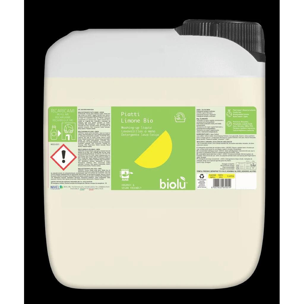Detergentul Biolù este certificat ecologic, respectând cele mai înalte standarde de calitate și siguranță. Marca italiană Biolù este cunoscută pentru angajamentul său față de utilizarea ingredientelor naturale și certificate organic. Acest detergent lichid este blând cu pielea, ceea ce îl face potrivit și pentru cei cu pielea sensibilă, asigurând o spălare plăcută și sigură. Ambalajul de 5 litri este o alegere responsabilă și economică. Oferă o utilizare îndelungată, reducând nevoia de reaprovisionare frecventă și deșeurile de plastic.
