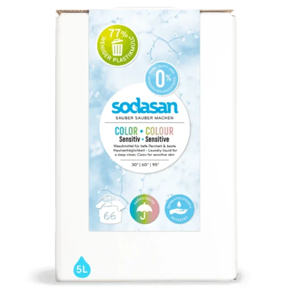 Detergentul bio lichid pentru rufe sensibile de la Sodasan este un produs specializat pentru spălarea hainelor persoanelor cu piele sensibilă, copii și persoane cu alergii. Această formulă neparfumată pe bază de săpun vegetal și surfactanți din zaharuri oferă o curățare eficientă fără a irita pielea delicată și asigură protecția fibrelor textile în fiecare ciclu de spălare.