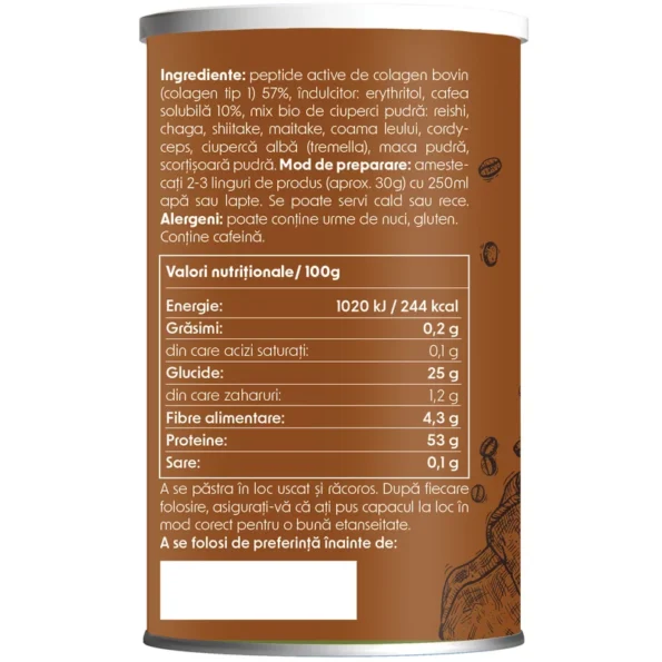 Etichete: colagen bovin, shake proteic, cafea solubilă, ciuperci bio, maca pudră, supliment nutritiv