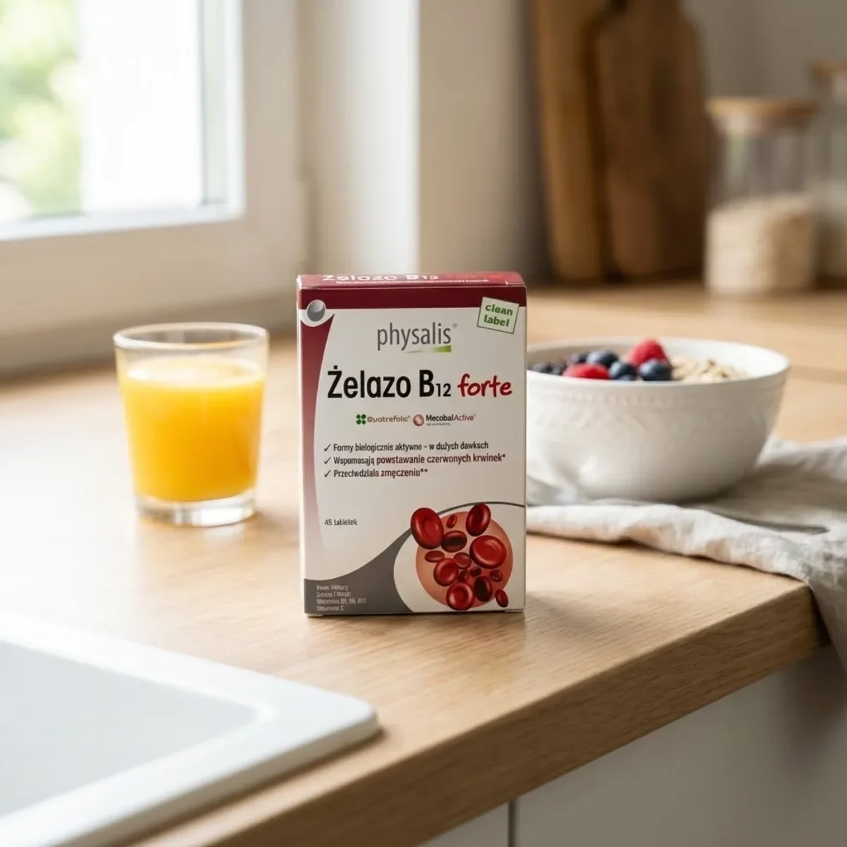 Complexul nutritiv Physalis Fier + Vitamina B12 forte combină fierul organic cu vitamine B active într-o formulă avansată ce sprijină formarea normală a globulelor roșii și a hemoglobinei. Fiecare tabletă furnizează 45 mg fier bisglicinat cu biodisponibilitate crescută, alături de vitamina B12 metilcobalamină și acid folic Quatrefolic® pentru absorbție optimă. Formularea include și cupru bisglicinat ce facilitează transportul fierului în organism, împreună cu vitamina C care crește rata de absorbție a fierului.