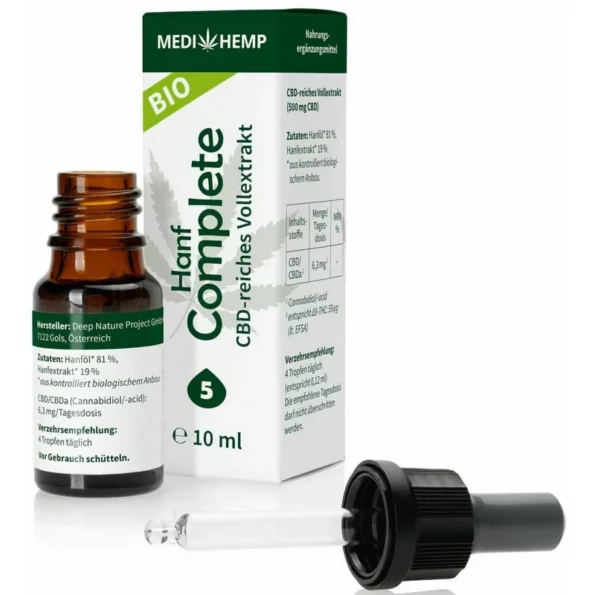Ulei de canepa 5% CBD Bio Hemp Complete 10ml Medihemp este un produs natural, obtinut din extract de canepa organica si ulei de seminte de canepa presat la rece. Acest ulei contine un spectru complet de canabinoizi, terpeni, flavonoide si fenoli, care actioneaza sinergic pentru a oferi beneficii multiple pentru sanatate.
