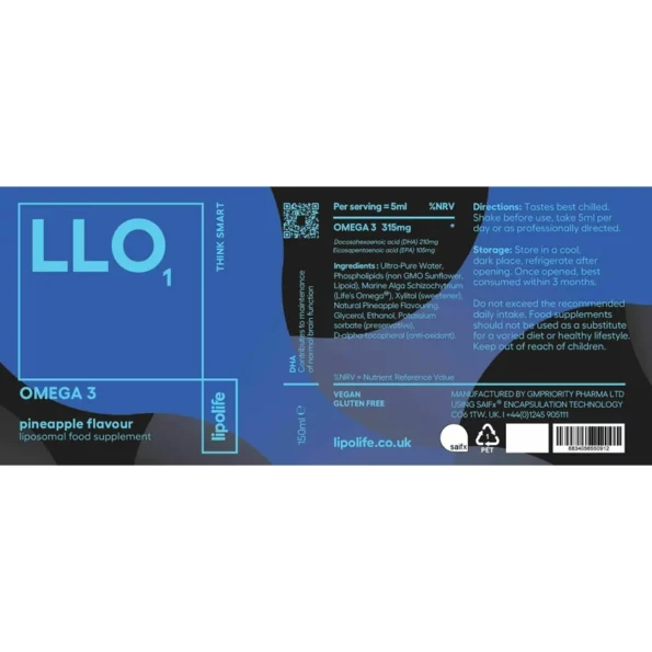 Omega 3 lipozomal vegana Lipolife LLO1 150ml are un gust placut de ananas si nu contine gluten, lactoza, soia, zahar sau alcool. Se administreaza usor cu ajutorul unei pipete dozatoare si se poate amesteca cu apa sau suc natural. O doza zilnica de 5 ml contine 210 mg DHA si 105 mg EPA, in total 315 mg de Omega 3 din sursa vegana. Un flacon de 150 ml asigura 30 de portii pentru o luna de zile.