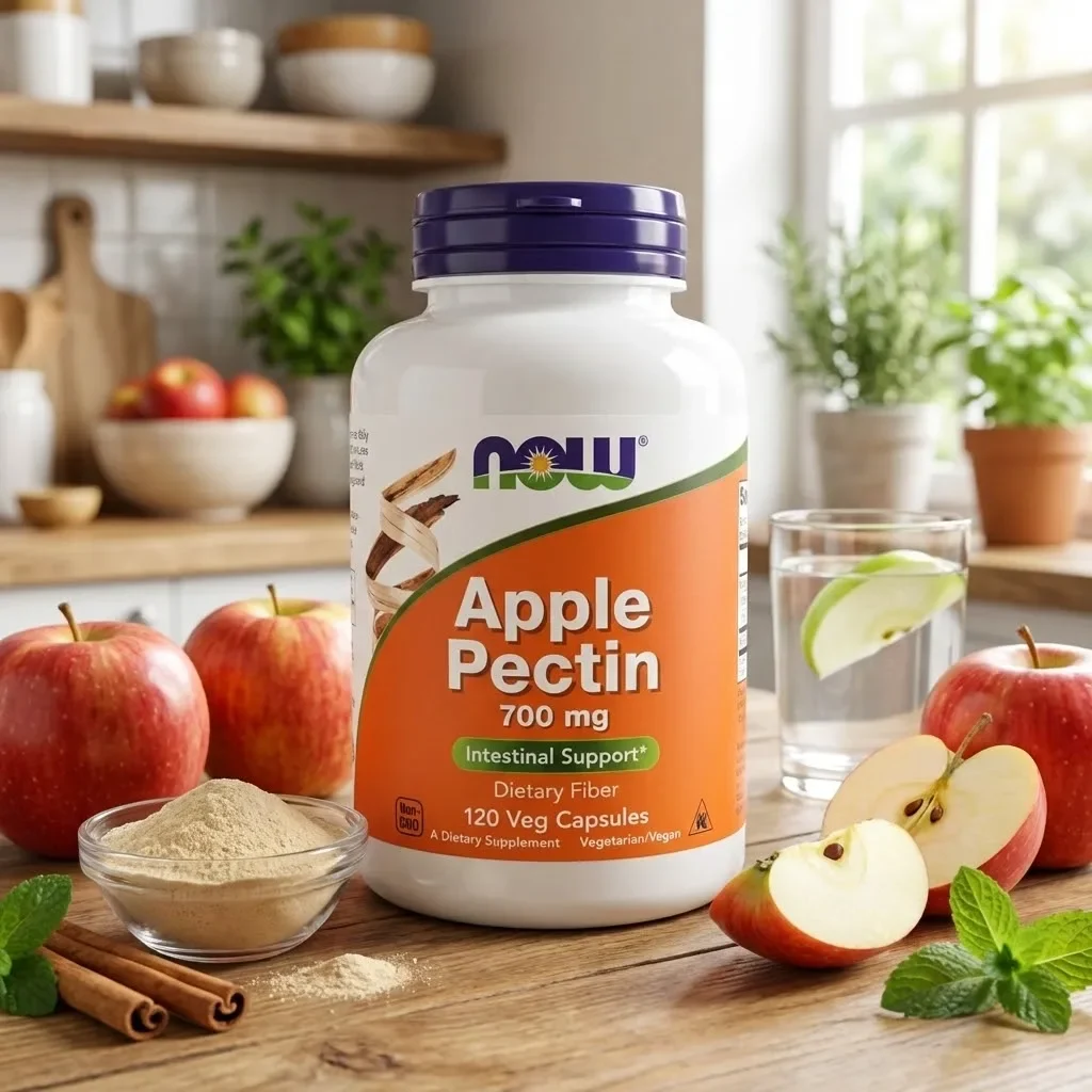Suplimentul pectină de mere cu fibre solubile de la NOW Foods este un produs alimentar care conține 700 mg de pectină de mere per capsulă, formulat pentru a sprijini sănătatea intestinală prin aportul de fibre dietetice solubile în apă. Produsul este fabricat într-o unitate certificată GMP (Good Manufacturing Practices), ceea ce asigură conformitatea cu standardele internaționale de calitate și siguranță în producție. Pectina de mere este o fibră vegetală naturală, extrasă din mere, care formează un gel atunci când intră în contact cu apa, contribuind astfel la funcționarea normală a tractului digestiv.