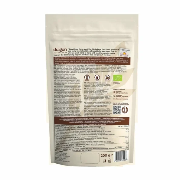 Pudra proteică din semințe de dovleac raw bio Dragon Star reprezintă o sursă naturală concentrată de proteine vegetale, obținută prin procesarea la temperaturi reduse a semințelor de dovleac cultivate organic. Cu un conținut bogat în nutrienți esențiali precum proteine, minerale și acizi grași benefici, această pudră se remarcă prin textura sa fină și gustul plăcut, specific semințelor de dovleac.
