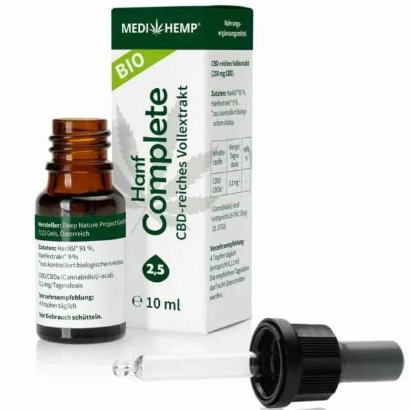Hemp Complete 2 5% CBD Bio 10ml Medihemp este un produs certificat ecologic, vegan, nefiltrat, nerafinat si fara OMG. Nu contine gluten, lactoza, conservanti sau aditivi artificiali. Nu are efect psihoactiv, deoarece contine mai putin de 0,05% THC (tetrahidrocanabinol), sub limita legala. Are un gust natural, usor amar si picant, datorat uleiului de canepa din seminte si extractului de canepa.