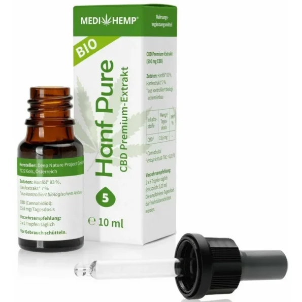 Ulei de canepa Hemp Pure 5% CBD Bio 10ml Medihemp este un produs premium, certificat organic, care contine extract pur de canepa cu o concentratie de 5% CBD (cannabidiol). Acest ulei este obtinut prin metoda blanda de extragere cu CO2, care garanteaza pastrarea tuturor substantelor naturale din planta de canepa. Uleiul este vegan, non-GMO si nu contine THC, pesticide, erbicide, solventi sau metale grele.