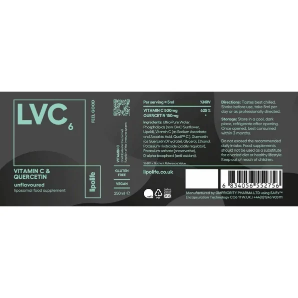Vitamina C si Quercitina complex lipozomal 250ml Lipolife LVC6 este un supliment alimentar de ultima generatie, care ofera o absorbtie superioara a substantelor active, direct in celulele unde sunt necesare. Acest produs contine Vitamina C sub forma de Quali-C, o sursa de inalta calitate fabricata in Scotia, si Quercitina, un flavonoid cu proprietati antioxidante, antiinflamatoare si imunostimulatoare.