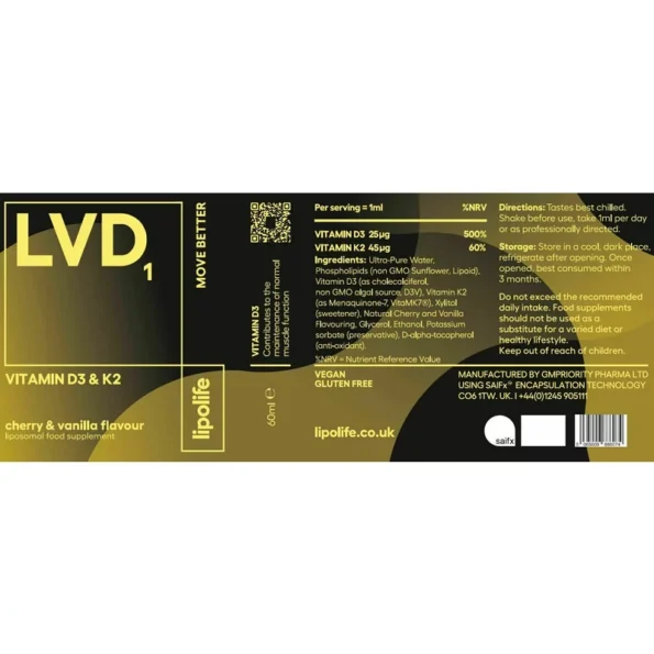 Vitamina D3 si K2 lipozomala 60ml Lipolife LVD1 este un produs inovator, care iti aduce beneficiile combinate ale vitaminelor D3 si K2, doua vitamine esentiale pentru sanatatea ta. Acest produs contine vitamina D3 extrasa din licheni si vitamina K2 sub forma de menachinona-7, ambele incapsulate in lipozomi, care asigura o absorbtie optima si o biodisponibilitate crescuta. Vitamina D3 si K2 lipozomala 60ml Lipolife LVD1 iti sprijina sistemul osos si muscular, datorita rolului lor in fixarea calciului in oase si prevenirea depunerii lui in vasele de sange. De asemenea, acest produs iti sustine sistemul imunitar si cardiovascular, datorita efectului antiinflamator si anticoagulant al vitaminelor D3 si K2. Vitamina D3 si K2 lipozomala 60ml Lipolife LVD1 este un produs vegan, nemodificat genetic, fara gluten, soia si zahar. Este ambalat intr-un flacon cu pipeta, care iti permite sa il dozezi cu usurinta. Poti consuma acest produs cu un pahar mare de apa, de preferat dimineata, pentru a beneficia de toate proprietatile sale.