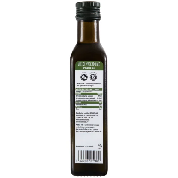 Nutriționiștii recomandă uleiul de avocado bio pentru conținutul ridicat de acizi grași mononesaturați și polinesaturați. Specialiștii în gastronomie apreciază aroma delicată și versatilitatea acestui ulei în preparatele culinare.