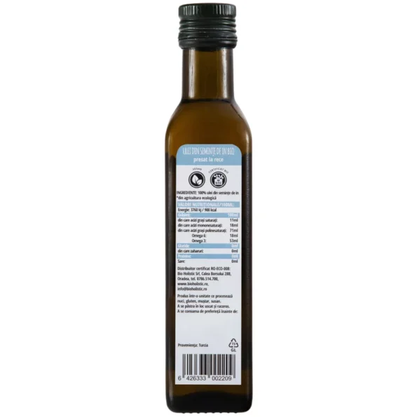 Procesul de producție bio certificat garantează că semințele de in folosite provin din agricultura ecologică controlată, fără pesticide sau îngrășăminte chimice. Presarea la rece asigură păstrarea tuturor proprietăților valoroase și a compușilor bioactivi naturali din semințele de in. Ambalat în sticlă închisă la culoare pentru protecție optimă împotriva oxidării, acest ulei își menține prospețimea și calitățile nutritive pe toată durata valabilității.