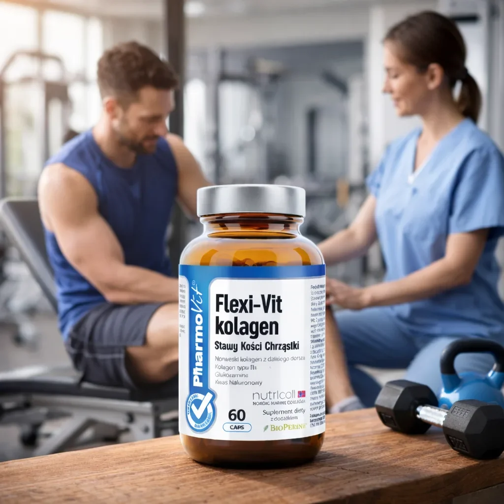 Suplimentul alimentar Pharmovit Flexi-Vit combină colagen hidrolizat tip I extras din pielea codului salbatic de Atlantic cu colagen tip II din cartilaj de pui. Formula include glucozamină sulfat 2KCL derivat din crustacee, MSM metilsulfonilmetan și acid hialuronic sub formă de hialuronat de sodiu.